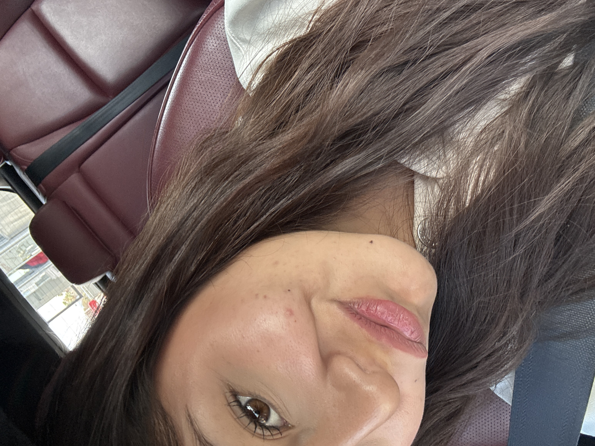 An angled, close-up photograph captures the right side of an individual's face within the interior of a vehicle. The subject, appearing female, displays dark brown, wavy hair, a fair complexion with a minor blemish on the cheek, and dark brown eyes with visible eyelashes. Her lips are coated with pinkish-mauve lipstick, forming a subtle, closed-mouth smile. She wears a light-colored garment. The immediate background consists of dark red, textured leather car seating with defined seams, suggesting a luxury or upscale vehicle interior. A black seatbelt is visible draped across the background seat. Through an upper-left vehicle window, a blurred exterior environment is discernible, showing indistinct building structures, some green foliage, and a faint, blurred object resembling a flag with red, white, and blue vertical stripes. While the potential flag's pattern aligns with the Mexican national flag, no explicit visual landmarks or identifiers within the image confirm the specific location as Tehuacán, Mexico.