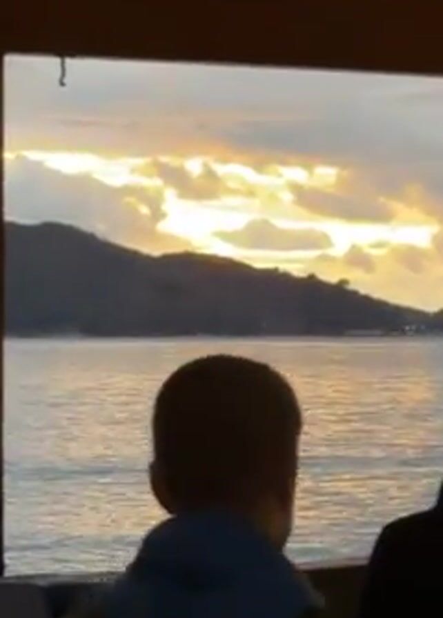 People are gathered on a covered deck, enjoying a sunset over the water. There are several people visible in the frame, including a person in a camouflage jacket. In the foreground, a barbecue grill glows red with hot coals. Some of the people are looking out at the view. The atmosphere appears relaxed and social.