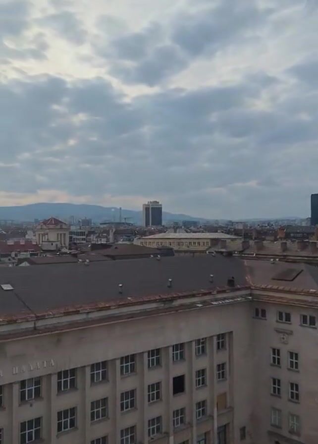The video pans across a cityscape with large buildings and snow-covered mountains in the distance. The sky is cloudy. The building in the foreground has the words "TELEFONNA PALATA" written on it. A yellow car is parked near the building. There is some construction activity in a courtyard near the building.