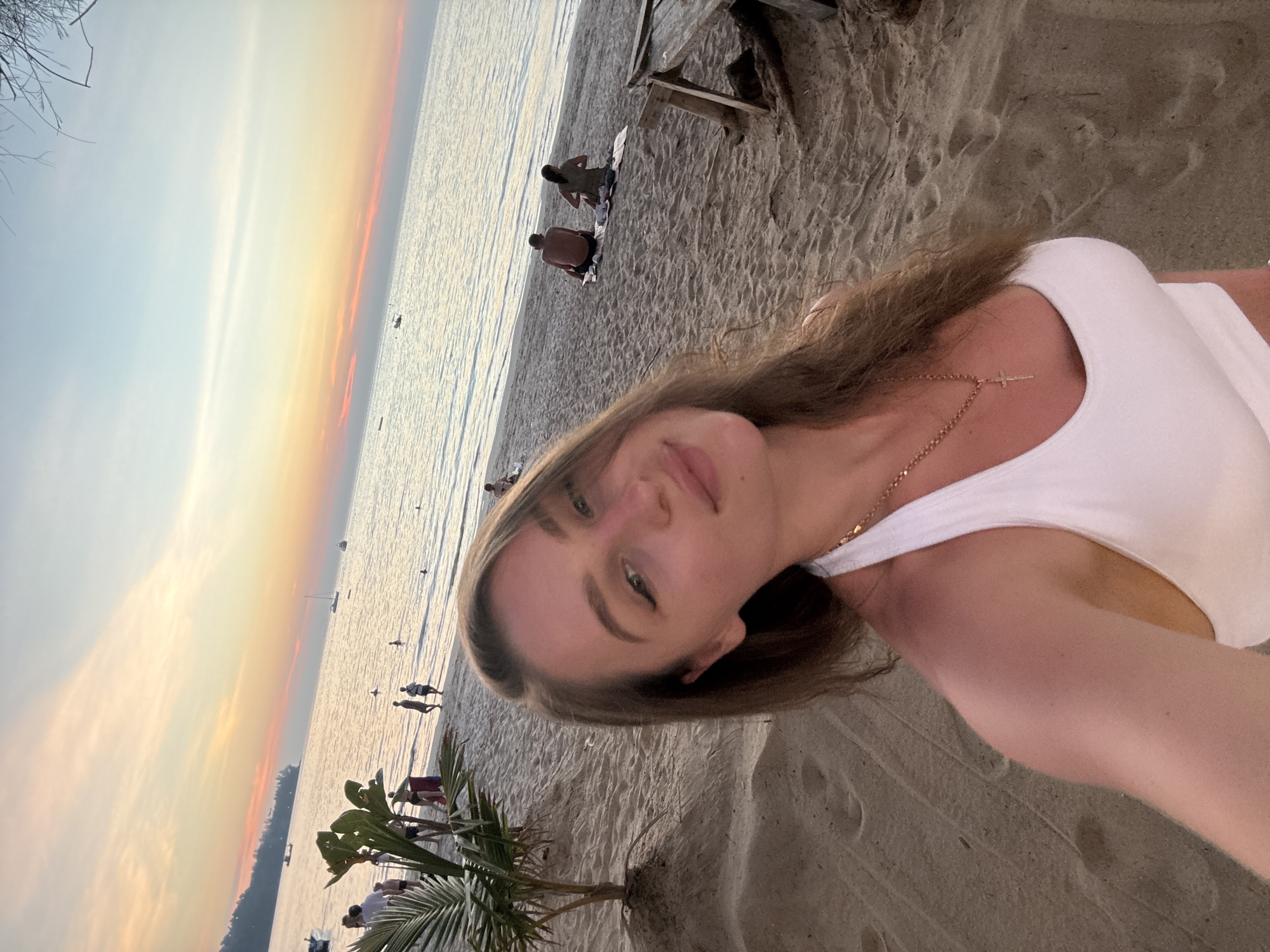 A young woman in a white tank top takes a selfie on Kamala Beach, Thailand, at sunset