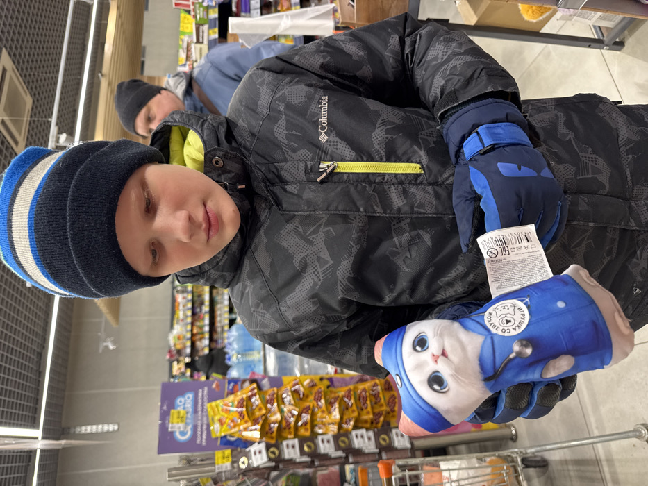 A young male, wearing a blue and white striped beanie, a grey Columbia brand winter jacket with a camouflage pattern and lime green accents, and dark blue winter gloves, is depicted holding a white plush toy cat dressed in a blue doctor's uniform with a stethoscope