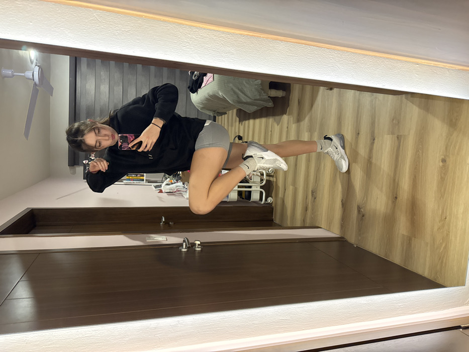 A young woman is reflected in a large, illuminated mirror. She's wearing a black hoodie, gray shorts, white socks, and white sneakers. She is holding a phone in her left hand taking a selfie. The background shows a bedroom with a ceiling fan, a bed with a patterned comforter, a wooden floor, and a closed brown door. A small utility cart is visible beside the woman. The mirror's light creates a glow around its edges.