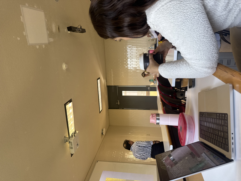 The image depicts an interior view of a classroom or conference room in Mexico City, Mexico. In the foreground, a person with dark, wavy hair, wearing a white textured long-sleeved top, is seated at a white table. They hold a black disposable coffee cup with a white lid in both hands. A gold ring is visible on their right hand. On the table, a silver-colored laptop is open, displaying an image on its screen. Adjacent to the laptop are a pink plastic container with a clear lid, a pink insulated water bottle, and a dark-colored smartphone. In the mid-ground, facing away from the viewer, an adult male with dark, balding hair is standing near a large white projector screen. He wears a long-sleeved shirt with horizontal dark and white stripes and dark trousers, appearing to address the room. Rows of white tables with dark chairs are arranged in the room. The room features light-colored, patterned walls and a matching ceiling. The ceiling is fitted with a white projector, two rectangular fluorescent light fixtures, a white circular smoke detector, and a dark speaker. A rectangular patch of lighter color on the ceiling indicates a past modification or repair. A dark gray door with a vertical glass panel on the back wall provides external light and egress. Two other individuals are partially visible seated in the background.