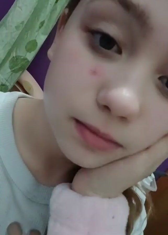 close-up of a young girl with light skin and brown hair. She is wearing a light-colored shirt with a butterfly cutout and a pink fuzzy wristband. She rests her face on her hand and rubs her eye at one point. Behind her is a purple wall, a green curtain, and a white object. The camera angle is slightly above her, as if the video was taken with a handheld device.