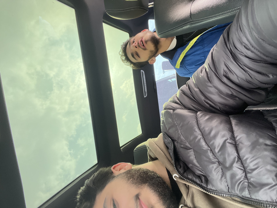 The image depicts the interior of a vehicle, viewed from a slightly elevated, forward-facing perspective. Two adult males are visible. The subject in the immediate foreground, positioned to the left, is partially cropped, showing the left side of his face, a beard, and a slight smile. He wears a dark, possibly black, puffer jacket over a light brown hooded sweatshirt. The second subject is seated further back, to the right, partially obscured by the foreground subject's right arm and shoulder. This individual has a beard, dark hair, and is looking upwards with his mouth slightly ajar. He wears a blue jacket with a prominent yellow stripe near the collar, over a white-collared shirt and a dark, possibly patterned, sweater. The vehicle's interior features black upholstery, specifically visible on the headrest of the passenger seat. A prominent glass panoramic roof or sunroof occupies the upper portion of the frame, revealing a light blue sky with scattered white clouds. No external geographical markers are identifiable to confirm the specific location within Dummar Municipality, Syria. Both individuals appear to be passengers or the driver and a passenger, seated in what appears to be the front cabin of the vehicle. No explicit interactions between the subjects are depicted.