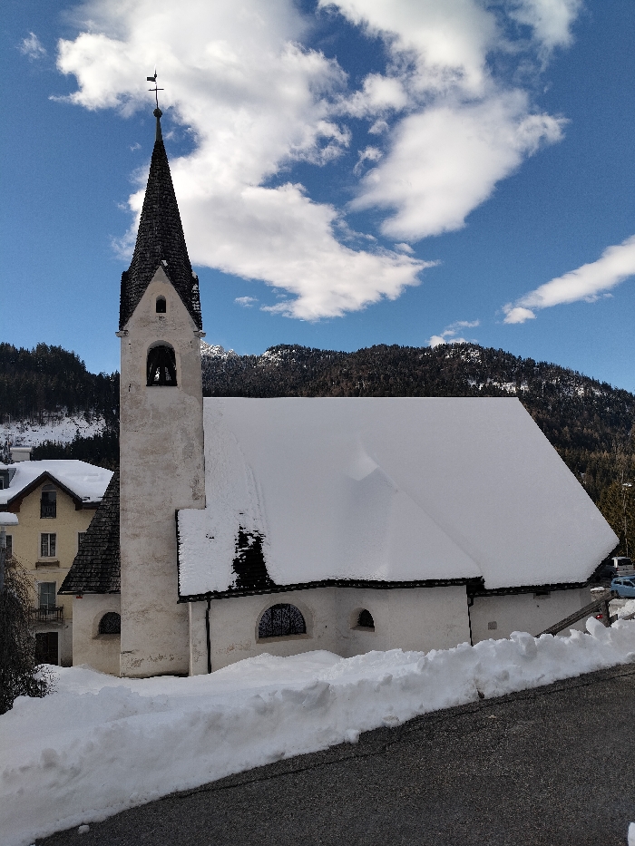 The image displays a white stucco church in Serdes, Italy, during winter conditions