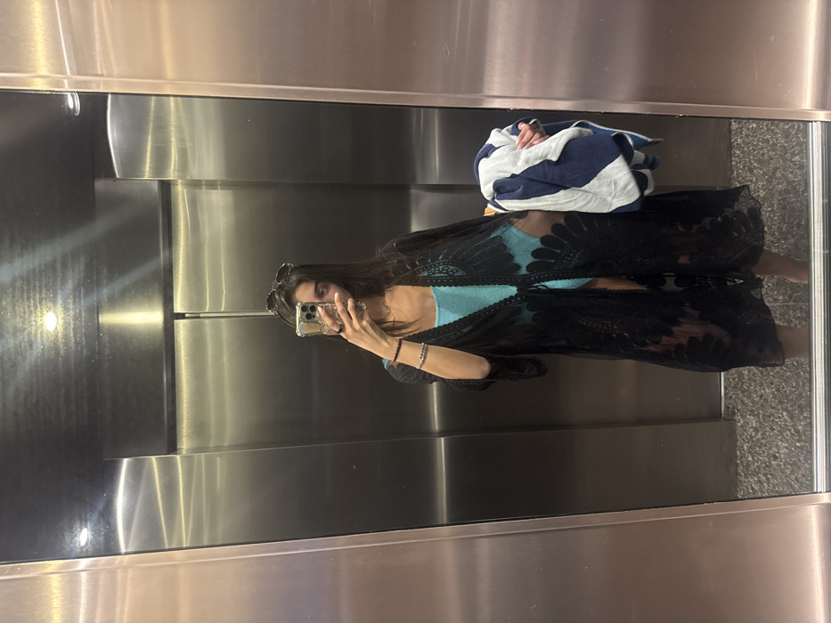 A young woman is taking a selfie in a mirrored elevator. She's wearing a light blue top, a sheer black kimono, and bracelets on her left wrist. Her dark hair hangs down her back. Sunglasses are perched on her head. A blue and white striped towel is draped over her shoulder. The elevator's interior features a polished silver surface and a dark, textured floor. The mirror reflects the elevator's interior.