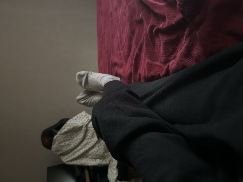 The image displays an indoor scene in a room located in Tashkent, Uzbekistan, viewed from a first-person perspective looking down and forward. In the foreground, the subject's lower legs are visible, clad in black fabric trousers, with the left leg crossed over the right. To the right, a bed is covered with a dark red, textured blanket that appears rumpled. Two feet, covered in light grey socks, are resting on the red blanket further from the viewer. In the background to the left, a dark chair with a light-colored shirt, featuring a small repetitive pattern, draped over its back is visible. A portion of a dark electronic screen is partially obscured behind the chair. The wall behind the furniture is a plain, light brown or grey. The room is dimly lit, with soft, diffused illumination.
