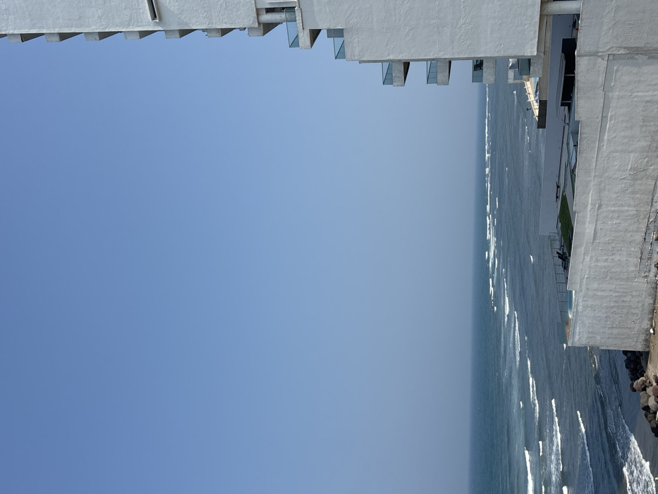 The image displays an elevated coastal scene in Veracruz, Mexico, under a clear, light blue sky that occupies approximately the upper two-thirds of the frame. The Gulf of Mexico spans the mid-ground, characterized by dark blue water with numerous distinct, parallel lines of white-capped waves approaching the shoreline. A modern, multi-story building, constructed of light-colored (likely white) material, occupies the entire right vertical third of the image. This structure features a series of staggered balconies, each equipped with transparent glass railings. In the lower mid-ground, a textured white concrete retaining wall runs horizontally, acting as a barrier. Above this wall, an elevated terrace is visible, featuring a dark-bottomed swimming pool with a glass perimeter, two dark lounge chairs, and manicured green landscaping. A narrow, rocky section of shoreline is present at the extreme lower-left where the waves break. No individuals or specific human activities are discernable within the depicted scene.