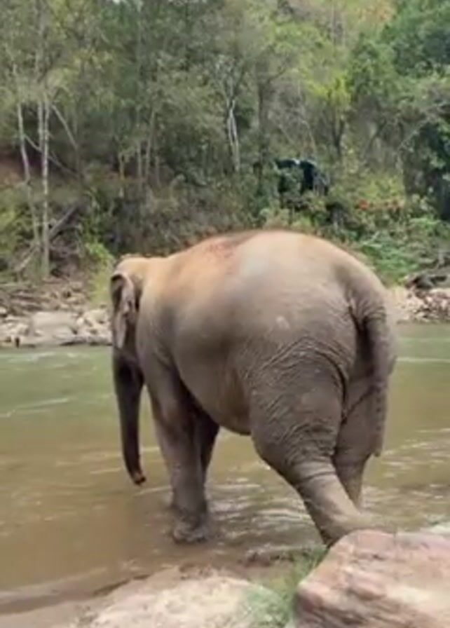 n elephant wading in a river. The elephant is facing away from the camera and standing in shallow water. The river is surrounded by lush green vegetation and trees. The elephant is gray and has wrinkled skin. There is a small rock on the shore in the bottom right corner of the frame. The sky is overcast.
