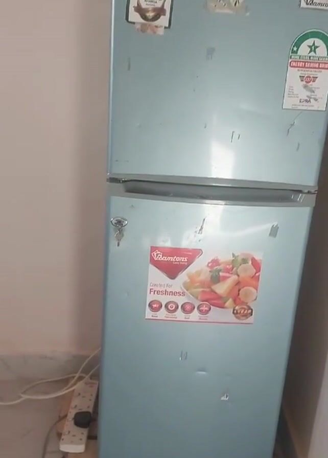 light blue, two-door refrigerator standing against a wall in a room. The refrigerator has a key hanging from the bottom door's lock. A sticker with a fruit salad image is on the bottom door, reading "Created for Freshness." A "Karibu Kitchen" sticker is on the top door, along with an energy-saving guide label. A power strip is on the floor near the refrigerator's power cord, placed on a small wooden platform. The refrigerator appears to have some minor dents and marks on its surface. The wall is painted a light color, and the floor appears to be tiled.