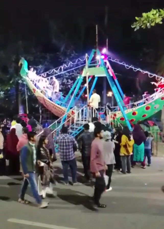 At night, in a public space, a "pirate ship" amusement ride moves, backlit and lit with colored lights