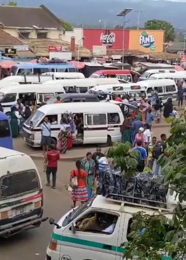 busy bus station filled with numerous white and blue vans. Many people are moving around the vehicles, presumably boarding or disembarking. Some appear to be carrying luggage. In the background, buildings are visible with signs for Coca-Cola and Fanta. Distant mountains can be seen on the horizon. The atmosphere is lively and bustling, indicating a busy transportation hub.