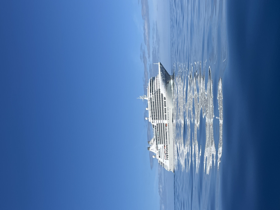 A large, white cruise ship dominates the center, creating strong reflections on the rippling water. The clear blue sky provides a stark contrast to the ship and water. The image is oriented on its side with the cruise ship seeming to sail upwards. A few soft clouds are visible along the horizon line, blending into the blue sky.