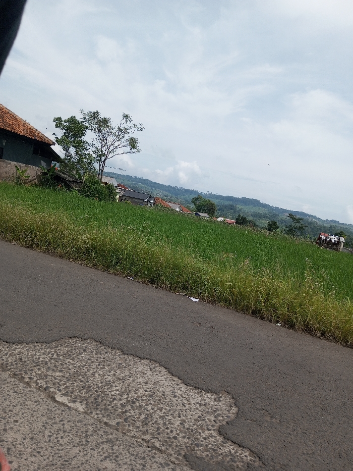 The image depicts a rural or semi-rural landscape in Kandenuwara, Sri Lanka, captured from a slightly elevated perspective. In the foreground, a dark asphalt road, exhibiting visible patching and textural variations in its surface, extends from the lower left towards the mid-right. No people or vehicles are present on the road. Adjacent to the road, to the right, a strip of wild grass leads to a large, vibrant green cultivated field, likely containing young crops such as rice, which slopes gently upwards from left to right. In the midground, several residential structures are visible, characterized by reddish-brown tiled roofs and light-colored walls, nestled amidst dense green foliage and trees. These houses appear to be built on an ascending terrain, overlooking the fields. No specific human actions or interactions are discernible. Beyond the houses and fields, the background features a series of undulating green hills and mountains, covered with dense vegetation, extending towards the horizon. The sky above is partly cloudy with patches of blue, suggesting fair weather conditions. The overall environment indicates an agricultural area with scattered housing, set against a backdrop of natural topography.