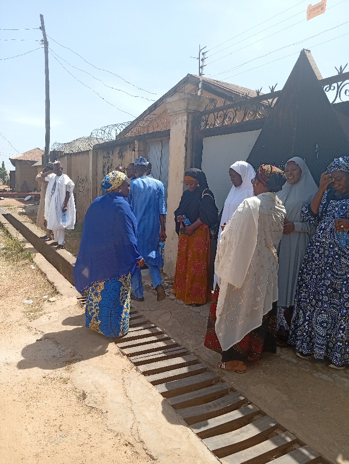 The image captures an outdoor scene in Sabon Tasha, Nigeria, under a clear sky. The foreground shows an unpaved dirt ground with a concrete drainage channel featuring a metal grate cover. A woman, partially viewed from the back, occupies the left foreground, wearing a royal blue head covering and a blue and yellow patterned dress. In the midground, a group of approximately ten individuals, predominantly women, are gathered near the entrance of a building. Their attire varies, including white, black, and patterned head coverings, alongside long dresses in colors such as white, light grey, black, brown, and blue with intricate patterns. Some individuals are engaged in conversation, with several women displaying smiles. One woman in a black headscarf holds a clear plastic bottle. A man in a white kaftan holds a plastic bottle on the far left, and another man in a light blue traditional garment stands centrally within the group. The background features a light-colored building with a dark, ornate metal gate. The building's perimeter wall is topped with razor wire and equipped with an electric fence system. A tall, dark utility pole with multiple overhead wires stands prominently on the left side of the frame. Distant structures, including a building with a reddish-brown roof, are visible further in the background under the clear sky.