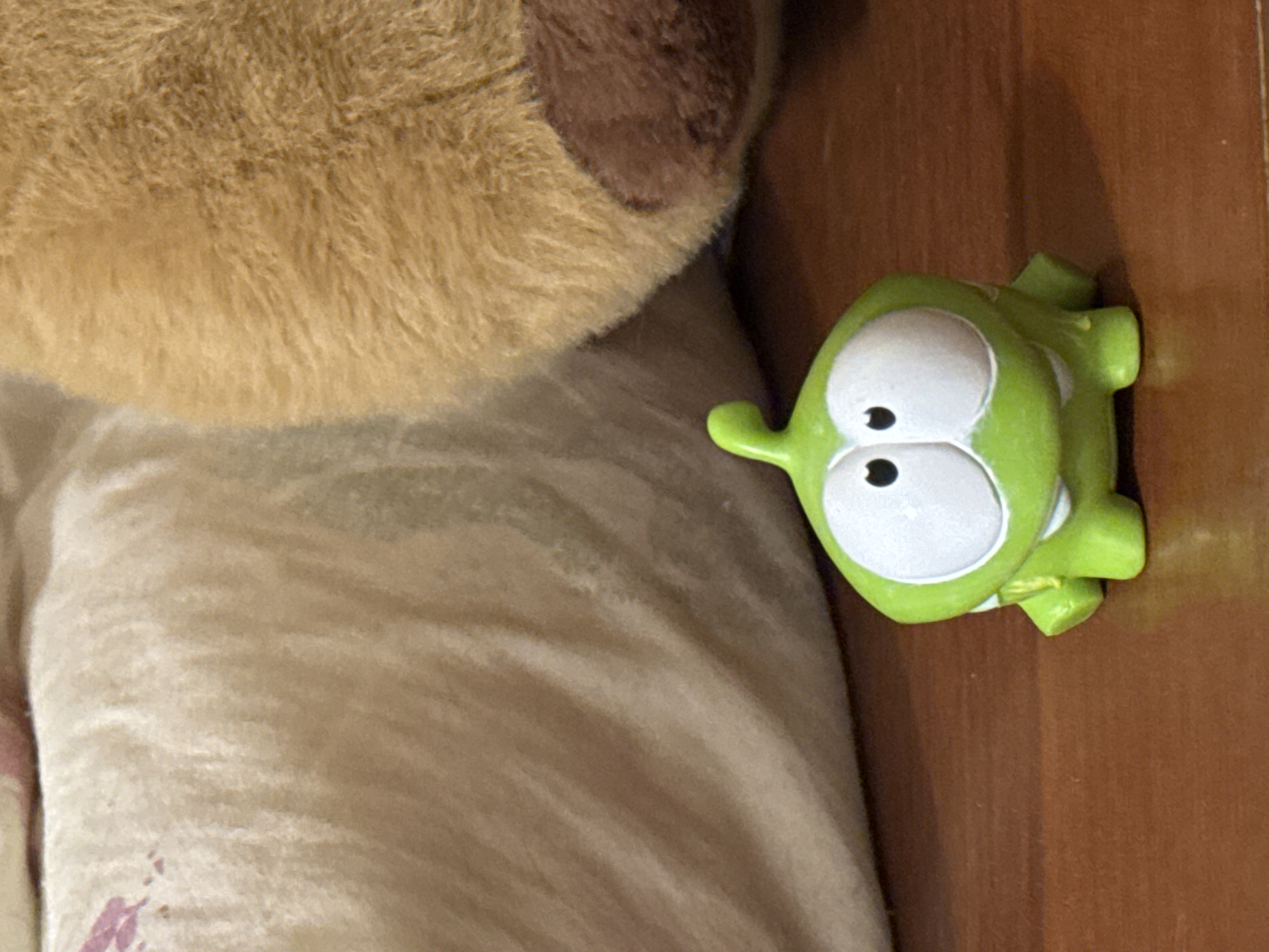 A lime green, cartoonish monster figurine with two large white eyes is sitting on a dark brown, wooden surface, possibly a table or a shelf. A tan-colored, plush teddy bear is partially visible to the left of the figurine, with its fluffy fur suggesting it's a stuffed animal. The plush toy rests on a cream-colored fabric with a slight sheen and subtle pattern. The location, Chaikovsky, Russia, is implied but not visually verified in the image. There are no people present.