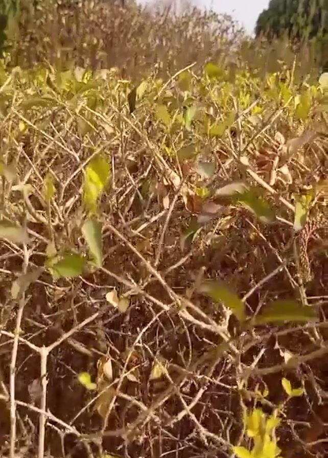 The camera pans across a hedge with green and brown leaves. Behind the hedge, another larger hedge is visible, mostly brown. In the background, trees are seen, and the sky is visible.