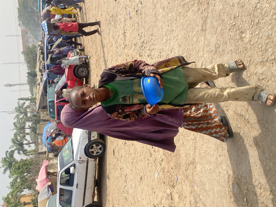 An outdoor scene in Maiburiji, Nigeria, depicts a busy, unpaved area