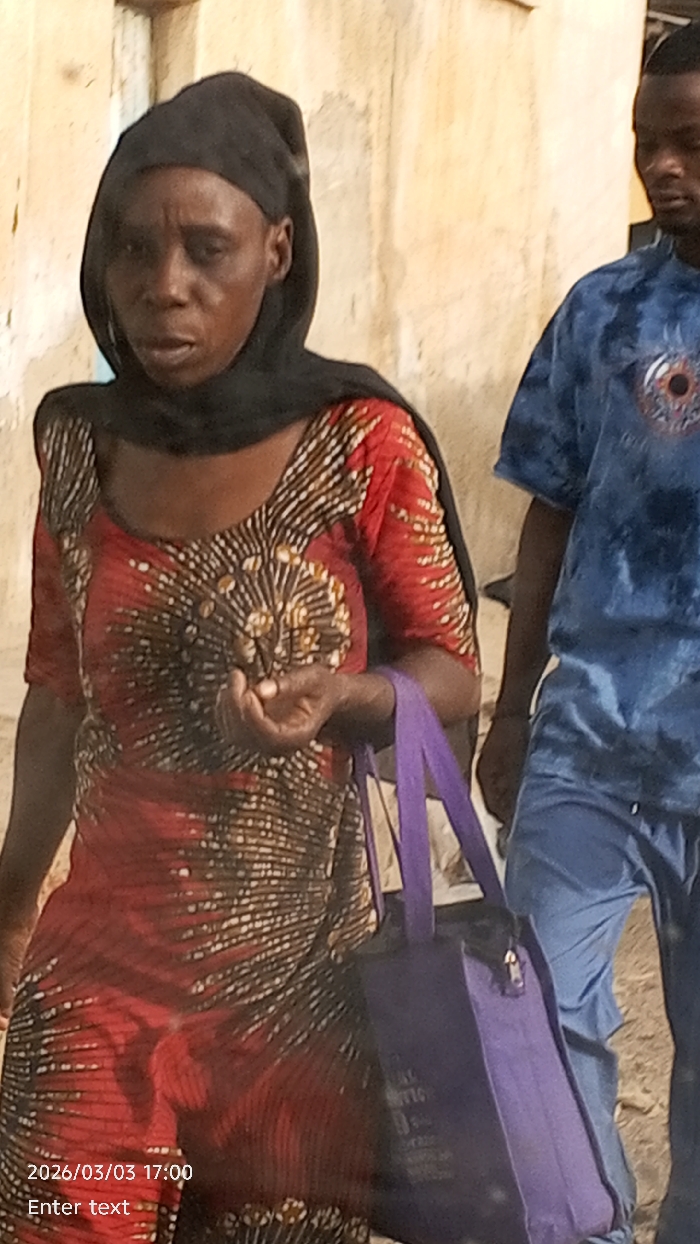 The scene, set in the city of Dakata, Nigeria, at 17:00 on March 3, 2026, shows two individuals outdoors against a light beige building wall. A dark-skinned adult female, wearing a black headscarf and a red, short-sleeved dress with intricate brown, black, and white patterns, occupies the foreground. She holds a purple fabric tote bag with a zipper and illegible white text in her left hand; her mouth is slightly ajar. Partially visible behind her to the right is a dark-skinned adult male, wearing a blue tie-dye shirt with a circular motif and blue trousers, looking downwards and to the right of the frame.