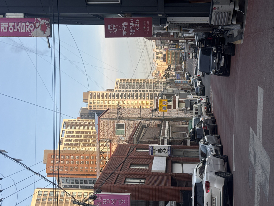 A narrow street in a Korean city, flanked by buildings of varying heights and styles