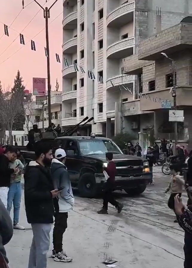 group of people standing on a street as a black pickup truck drives by. The truck has mounted artillery in the back, and there are people riding on the back of the truck as well. The people on the street are watching the truck as it drives by, and some are taking pictures or videos with their phones. The street is lined with buildings, and there are decorations hanging between the buildings. There is a sign in the distance that says "ROSE". Several children run in front of the truck. The time of day appears to be dusk, as the sky is pink.