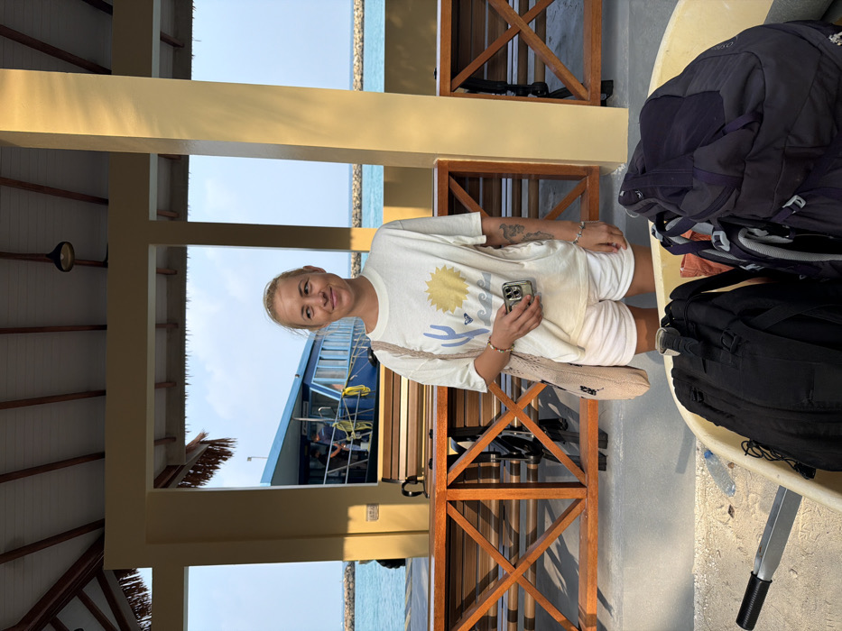 A blonde woman stands, smiling, on a covered deck near the ocean, holding a phone. She wears a white t-shirt with a sun graphic and white shorts, and has a tan bag over her shoulder. Behind her, a boat is visible through a window. Nearby are wooden benches and black backpacks. The scene is bathed in sunlight.