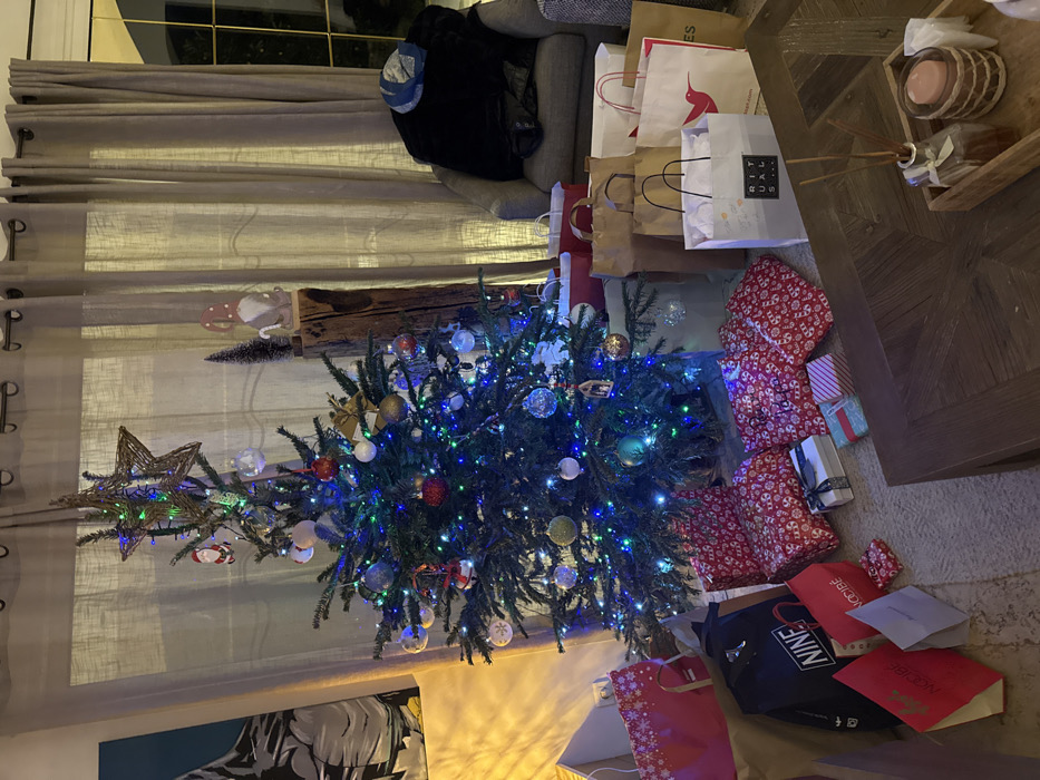 A decorated Christmas tree with a star topper is the focal point. Beneath the tree, wrapped gifts and shopping bags are scattered on the floor. A coffee table is next to the tree, with a candle and reed diffuser on top. A chair is in the background next to window drapes. Artwork can be seen on the wall below the tree.