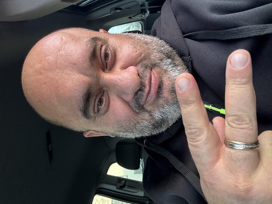 The image displays a male individual inside a vehicle, located in Entzheim, France. The subject is a bald man with dark eyebrows, brown eyes, and a full, grey beard. He is wearing a black hooded sweatshirt, with a segment of a neon green zipper pull visible near his chest. His left hand is raised, with the index and middle fingers extended, forming a V-shape. A two-tone ring, gold and silver-colored with small embedded stones, is worn on his left ring finger. The man looks directly at the camera with a slight smirk. The vehicle's interior features a dark headliner. Through the window to the subject's left, a light-colored building is visible under natural light, indicating an outdoor, daytime setting.