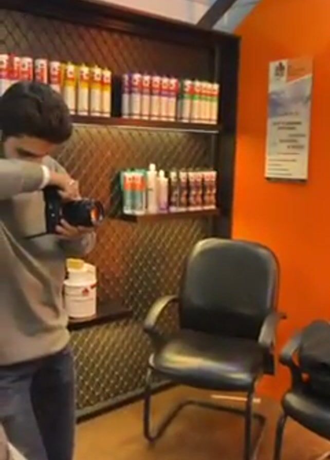 A man with dark hair and a beard is taking photos of a display of paint cans and bottles on a shelving unit. He is wearing a gray sweatshirt and blue jeans. He is holding a black camera and looking through the viewfinder. The shelving unit is made of black metal and has a diamond-shaped pattern on the back. The cans and bottles are of various colors and sizes. Behind the shelving unit is an orange wall with two framed posters hanging on it. In front of the shelving unit are two black chairs. The floor is a light wood color.