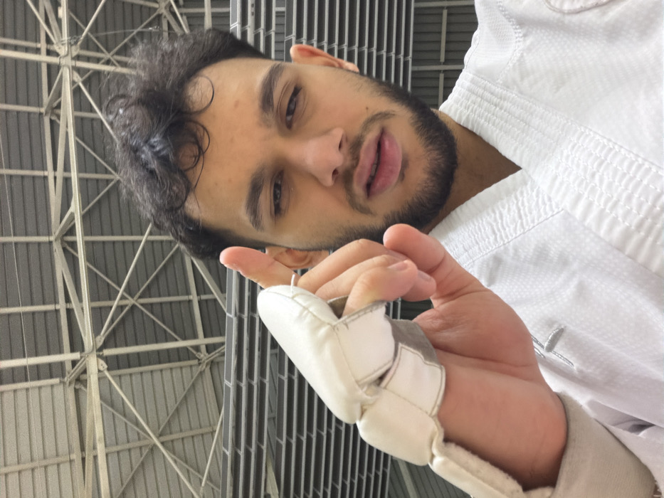 The image presents a close-up, chest-up view of a young adult male. He has dark, curly hair, a short beard, and a mustache. His expression is neutral as he looks directly into the camera, with his mouth slightly ajar. He is dressed in a white martial arts uniform (gi), notable for its textured fabric and V-neck collar. His left hand is raised towards the camera, partially obscured by a white padded protective glove, typically used in martial arts sparring. His left index finger is extended and points slightly upwards, appearing to hold a small, spherical white object. The background is an interior space, indicative of a large indoor sports facility, such as a gymnasium or arena, consistent with venues located in Plovdiv, Bulgaria. Visible overhead are a grey metal truss system and multiple horizontal panels, suggesting a high ceiling and functional infrastructure. The lighting is uniform, suggesting artificial illumination.