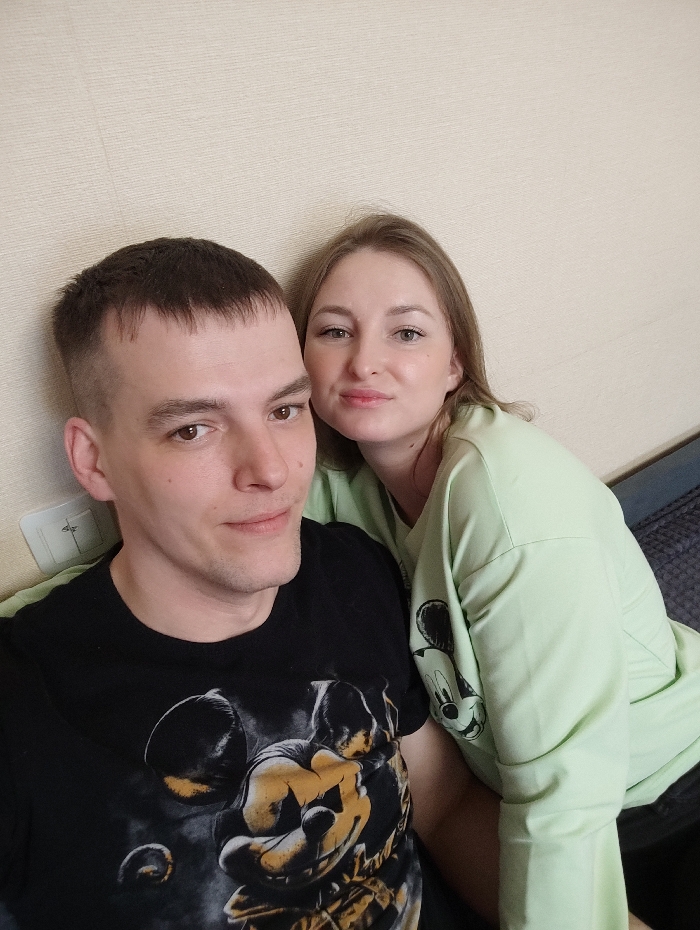 two individuals, one male and one female, seated closely together in an indoor environment. The male, positioned on the left, has short, dark hair and wears a black t-shirt featuring a large yellow and black graphic resembling a stylized Mickey Mouse head. The female, on the right, has long, light brown hair and wears a light green long-sleeved top with a black and white Mickey Mouse head graphic visible on the sleeve. Both individuals are looking directly forward at the camera. The background consists of a plain, light beige wall with a subtle textured pattern. A white electrical outlet is visible on the wall behind the male's left shoulder. A dark-colored fabric surface is partially visible in the lower right corner, indicating a seat. The specific location within the city of Chaikovsky, Russia, cannot be determined from the visual information presented.