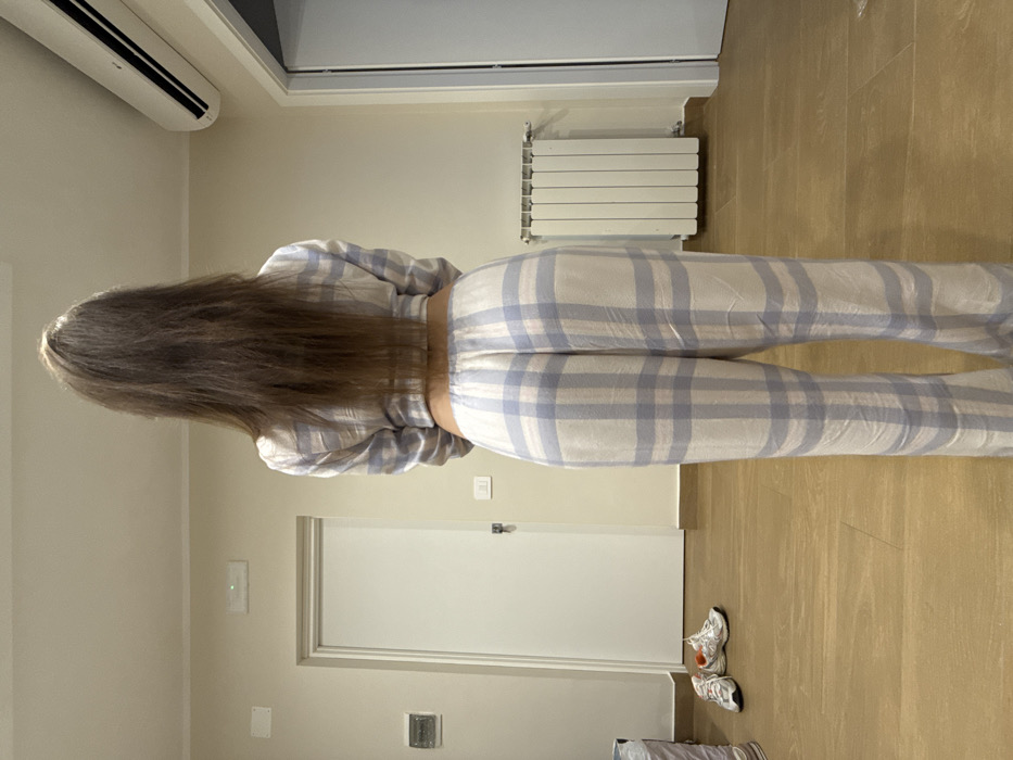 The scene depicts an indoor residential area in Scafati, Italy. A single individual, presumed female, stands centered in the frame, viewed from the back. She has long, dark brown hair extending down her back. The individual is wearing a two-piece plaid outfit consisting of a cropped long-sleeved top and loose-fitting pants; both garments display a pattern of light blue and faint pink squares on a white background. The room features light-colored, possibly off-white, walls and light brown wooden flooring. On the left side of the frame, a white door with a silver handle is closed. Above this door, a small green rectangular indicator light is affixed to the wall. Below and to the left of the light, a square wall panel, likely an intercom or thermostat, is visible. On the floor in the bottom-left corner, a pair of athletic shoes, predominantly white with orange accents, rests next to a partially visible light-colored bin or container. On the right side of the frame, a white panel radiator is mounted on the wall. Above the radiator, higher on the wall, an air conditioning unit is installed. A white light switch panel is positioned on the wall between the individual and the radiator. A partial view of a doorway leading to another area is visible on the far right. The ceiling is flat and light-colored, and the room appears evenly illuminated. No interactions are observed.