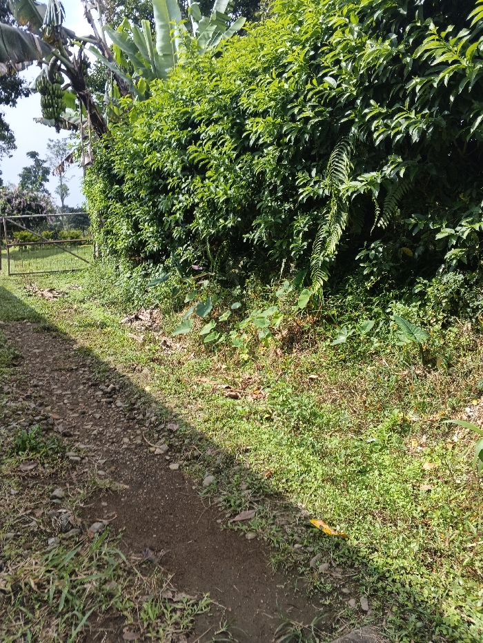 A vibrant, green landscape unfolds along a dirt path. Lush vegetation climbs upward, forming a dense wall of leaves. Ferns cascade from the wall, adding a touch of texture. In the distance, banana trees and a gate mark the transition to an open field. A yellow object rests amidst the grass on the right side of the path. The scene is bathed in sunlight, creating deep shadows on the path.