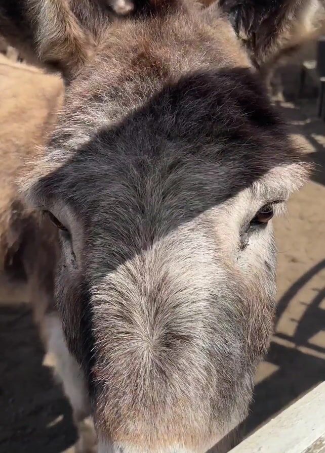 A close-up video shot from the ground shows several donkeys standing inside a fenced enclosure