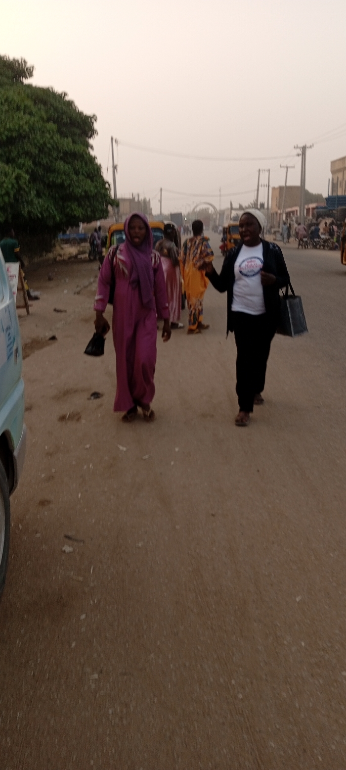 Two women walk along a dirt road in what appears to be a town in Africa. The woman on the left wears a purple robe and headscarf. The woman on the right wears a white t-shirt and black pants. Both carry bags. Other people and vehicles are visible in the background, along with trees and buildings. The sky is overcast.