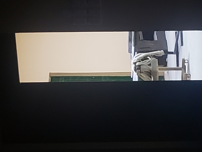 A rectangular opening reveals a glimpse into another room. A beige wall descends to a dark green surface. To the right, a gray chair and other objects covered in fabric are visible. Part of a wooden machine with a wheel and handle stands out in the foreground of the opening. The surrounding frame is dark.
