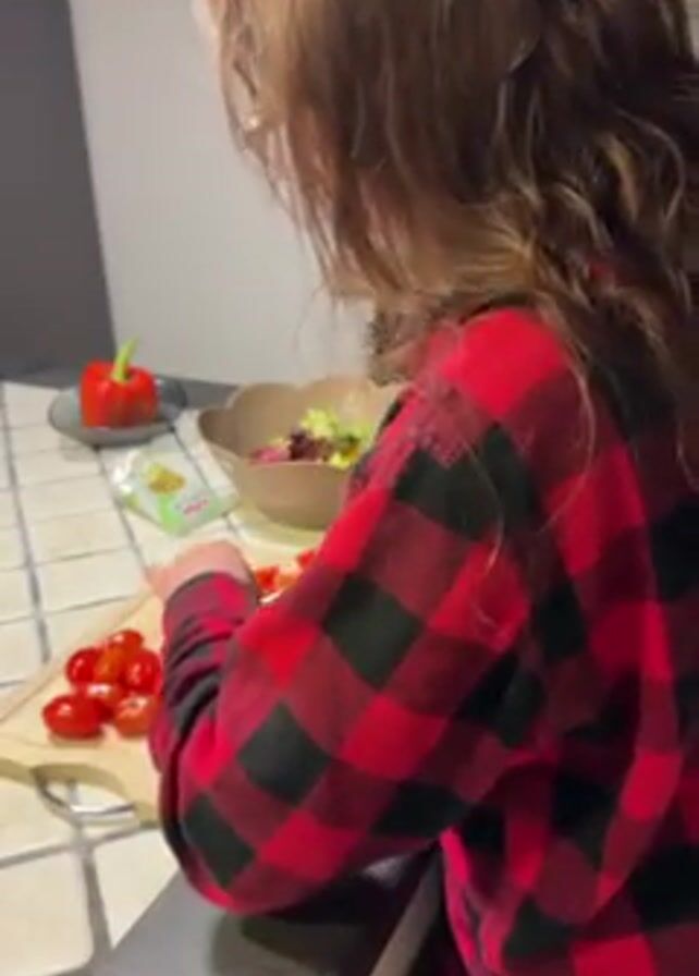 A woman wearing a red and black plaid shirt stands at a kitchen counter, facing away from the camera. She is cutting cherry tomatoes on a wooden cutting board. To the left of the cutting board is a red bell pepper on a small gray plate. Behind the cutting board, in the center of the frame, is a brown salad bowl containing lettuce and other ingredients. The kitchen counter is tiled with a grid pattern of small, light-colored tiles. The overall lighting in the kitchen appears to be soft and diffused.