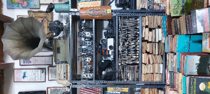 The image showcases a cluttered space with a focus on vintage and antique items. A gramophone with a large horn is prominent, positioned near framed pictures on a wall. A metal shelving unit contains several antique cameras, video tapes, and books. The books vary in size and color, forming a dense stack. Overall, the scene suggests a collection or storage area filled with a diverse range of historical objects.