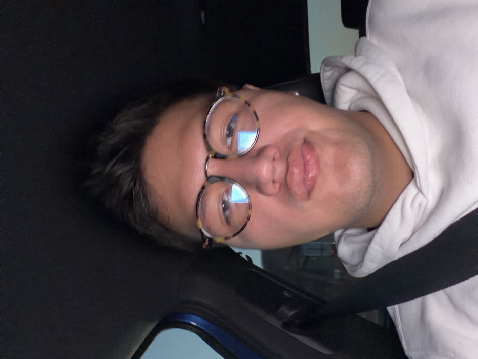 A man wearing glasses and a white hooded sweatshirt sits in the driver's seat of a vehicle, as indicated by the black seatbelt. He has dark hair and facial stubble. The car's interior is visible, including a blue panel near the window. Reflections of light are visible in his glasses. The man is looking directly at the camera with slightly pursed lips.