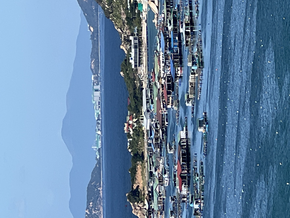 A coastal scene features a bay filled with numerous boats, positioned adjacent to a densely built-up area with houses and buildings lining the shore. The water is a deep blue color, marked with the white glints of sunlight. Mountains rise in the background, fading into a light blue sky, while a strip of green vegetation separates the buildings from the water's edge. The image is presented with a vertical orientation.