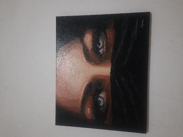 A horizontal rectangular painting is depicted, mounted on a light-colored, textured wall in an interior space within the city of Al Hadaba, Egypt. The painting portrays a close-up of an individual's eyes and the upper portion of their face. The eyes are a striking light blue-grey, framed by dark eyebrows. The skin tone is warm, appearing brownish-pink with a visible, possibly granular or glittery, texture. Dark hair is visible around the temples, blending into a dark, almost black background. The lower part of the face, from the nose downwards, is obscured by a black fabric, indicative of a niqab or similar veil, which features subtle folds. A handwritten signature, appearing to be "Shimaa," is located in the bottom right corner of the painting. The wall itself is an off-white or very light grey with a fine stucco-like finish. The lighting is uniform, highlighting the painting's texture.