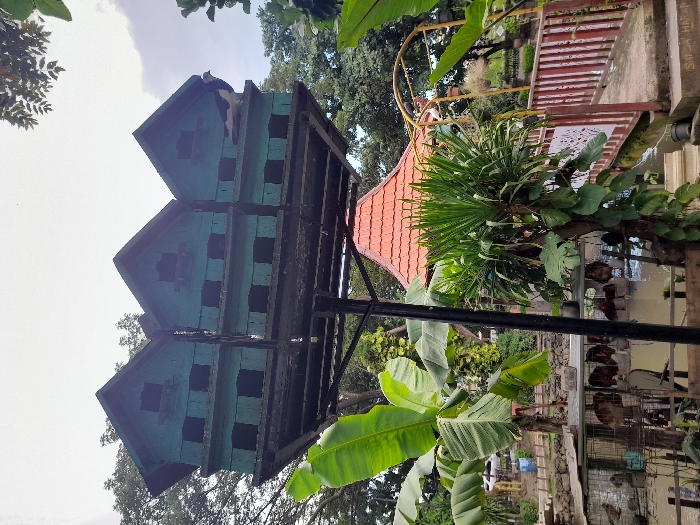 three wooden birdhouses painted a dark turquoise blue, mounted on a metal frame, positioned over a small pond. The birdhouses are three-tiered with multiple openings for birds to enter and exit. One birdhouse is occupied by a white dove with black markings. The birdhouses are situated in a tropical garden with a red tiled roof gazebo in the background. The garden is lush, featuring banana plants and other foliage. The pond is surrounded by a red wooden railing with a white painted design. The scene is located at the coordinates -7.441 latitude, 112.705 longitude, in the Kecamatan Sidoarjo, Indonesia.