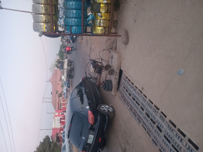 A car sits near a tire shop with a rack of new tires visible. The car is parked next to a drain. A small compressor rests on a stone slab beside the car. A motorcycle and other vehicles are visible on the street. Buildings and utility poles line the street in the background. The sky is overcast.