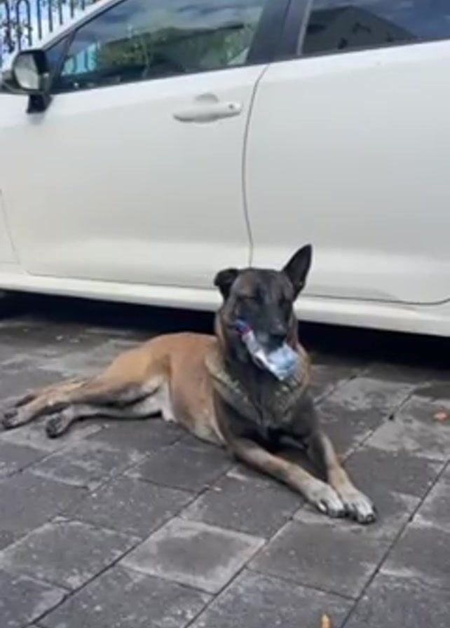 - "A Belgian Malinois dog is lying on a gray brick surface next to a white car, holding a clear plastic bottle in its mouth" by FM-lYn4w2, licensed under CC BY 4.0