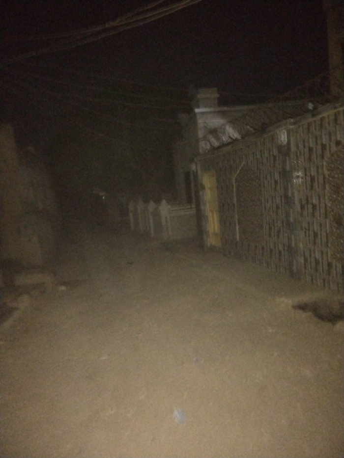 A dimly lit street at night. A building with a wooden fence and razor wire is on the right. A white picket fence lines part of the opposite side. Power lines stretch across the dark sky. The street is sandy, and visibility is poor. The scene is silent and potentially unsettling due to the low light and security features.