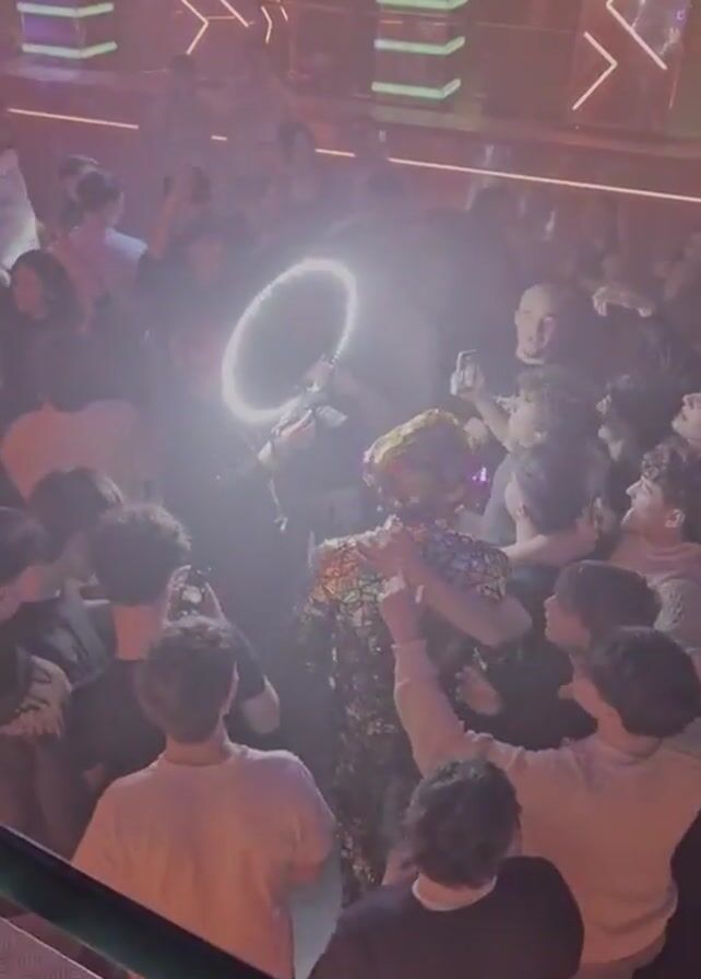 crowded dance floor in a nightclub. A performer wearing a patterned costume and a round, glowing light is in the center of the crowd, interacting with the partygoers. Some attendees are dancing and holding up their phones to record. A DJ booth is visible above the dance floor, and there is a VIP lounge sign nearby. Later in the video, a woman in a striped top and black underwear dances on an elevated platform against a backdrop of projected imagery. The lighting is colorful and dynamic, adding to the nightclub atmosphere.
