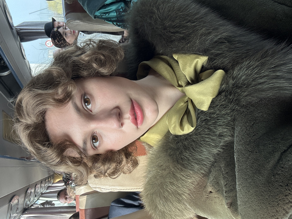 An image captures a young adult female with light skin, light brown curly hair, and brown eyes, looking directly forward. She is wearing a dark olive-green coat with a substantial fur collar, over a chartreuse-colored blouse tied with a large bow at the neckline. The subject is seated inside a passenger bus, indicated by visible overhead compartments, bus windows, and multiple rows of seats. In the background, on the left, a light-skinned male with dark hair is partially visible looking forward. On the right, a female wearing a patterned head covering and a white jacket is visible, along with a male wearing a dark bowler hat behind her. Another individual in a green, patterned garment is partially seen on the far right. A blurred outdoor environment, including a circular sign with a red border and the number "80," is visible through the bus window. The scene is located in Huangdao District, China.