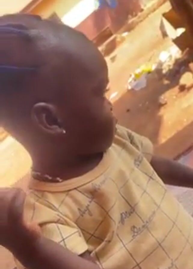 A young child with dark skin sits on a patterned mat in an outdoor area. They are wearing a tan shirt with a grid pattern and words. They have small diamond earrings and their hair is styled with black and blue braids. The camera pans around them, showing a building with a maroon and yellow exterior, a motorcycle parked nearby, and various household items. There are also people in the background, but they are partially obscured. The overall atmosphere appears to be casual and domestic.