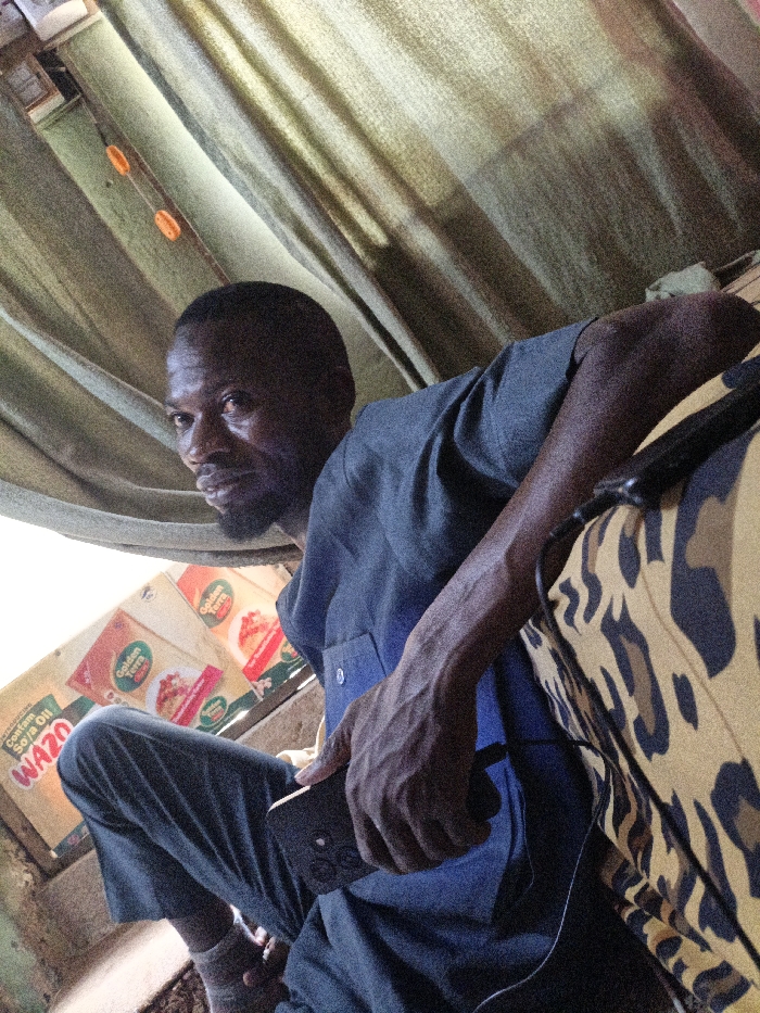 A dark-skinned adult male, clean-shaven save for a goatee and with short dark hair, is seated and angled towards the camera in what appears to be a market stall or small shop in Gwagwarwa, Nigeria